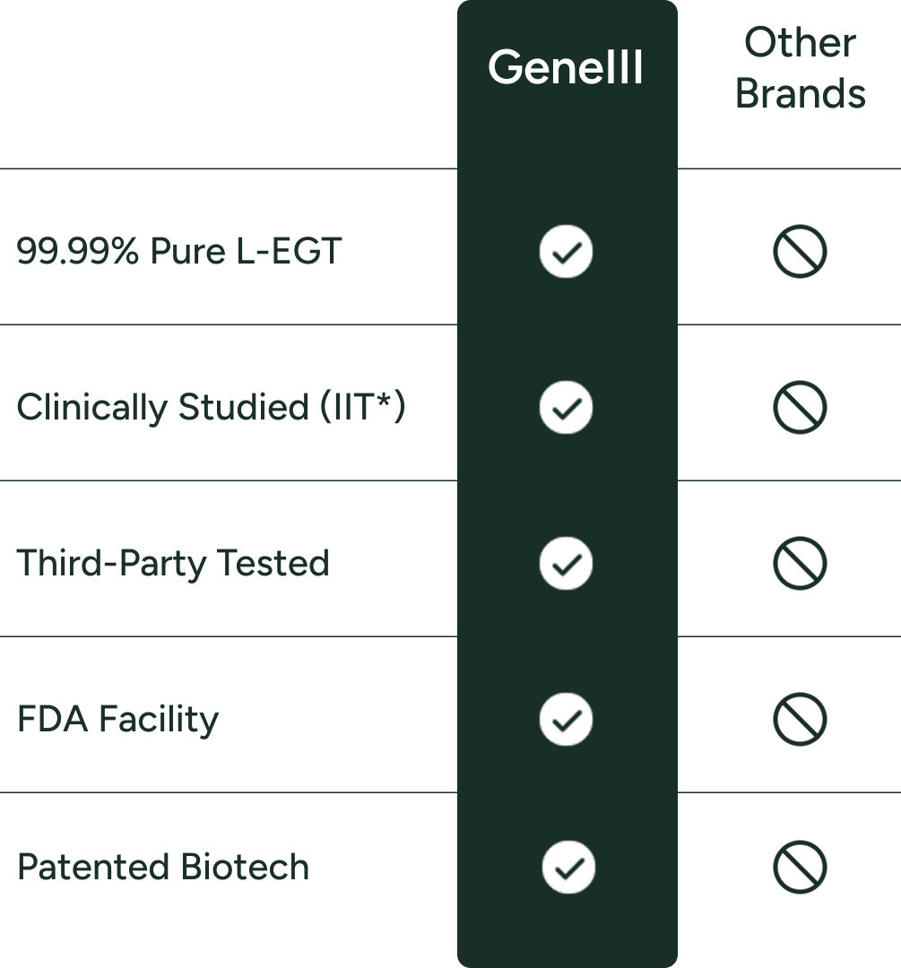 At GeneIII, we hold ourselves to uncompromising standards of quality, purity, and transparency. Our L-Ergothioneine is produced with advanced patented fermentation technology, achieving 99% purity and exceptional bioavailability. Each formulation reflects our commitment to scientific precision and genuine care for your well-being.